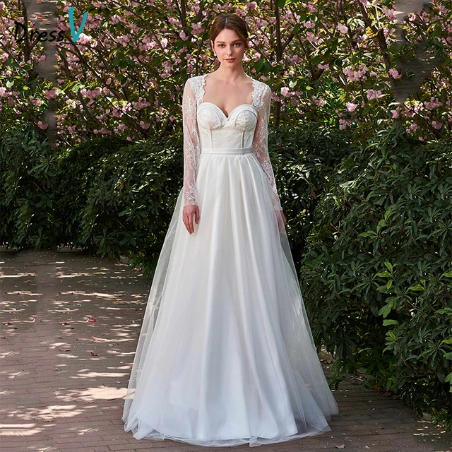 Dressv Ivory Long Wedding Dress Sweetheart Neck Long Sleeves A Line