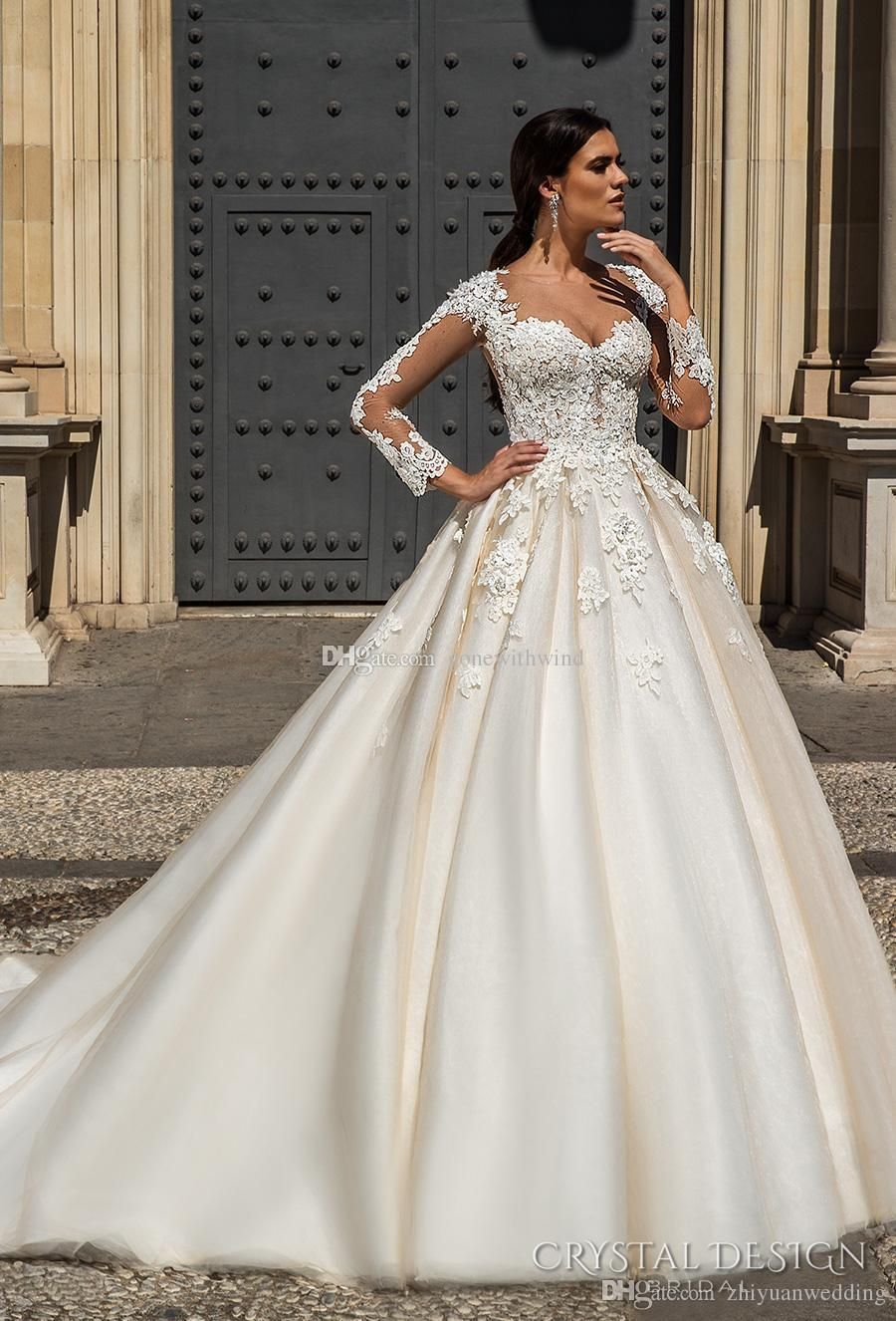 Long Sleeves Royal Train Lace Ball Gown Champagne Wedding Dresses