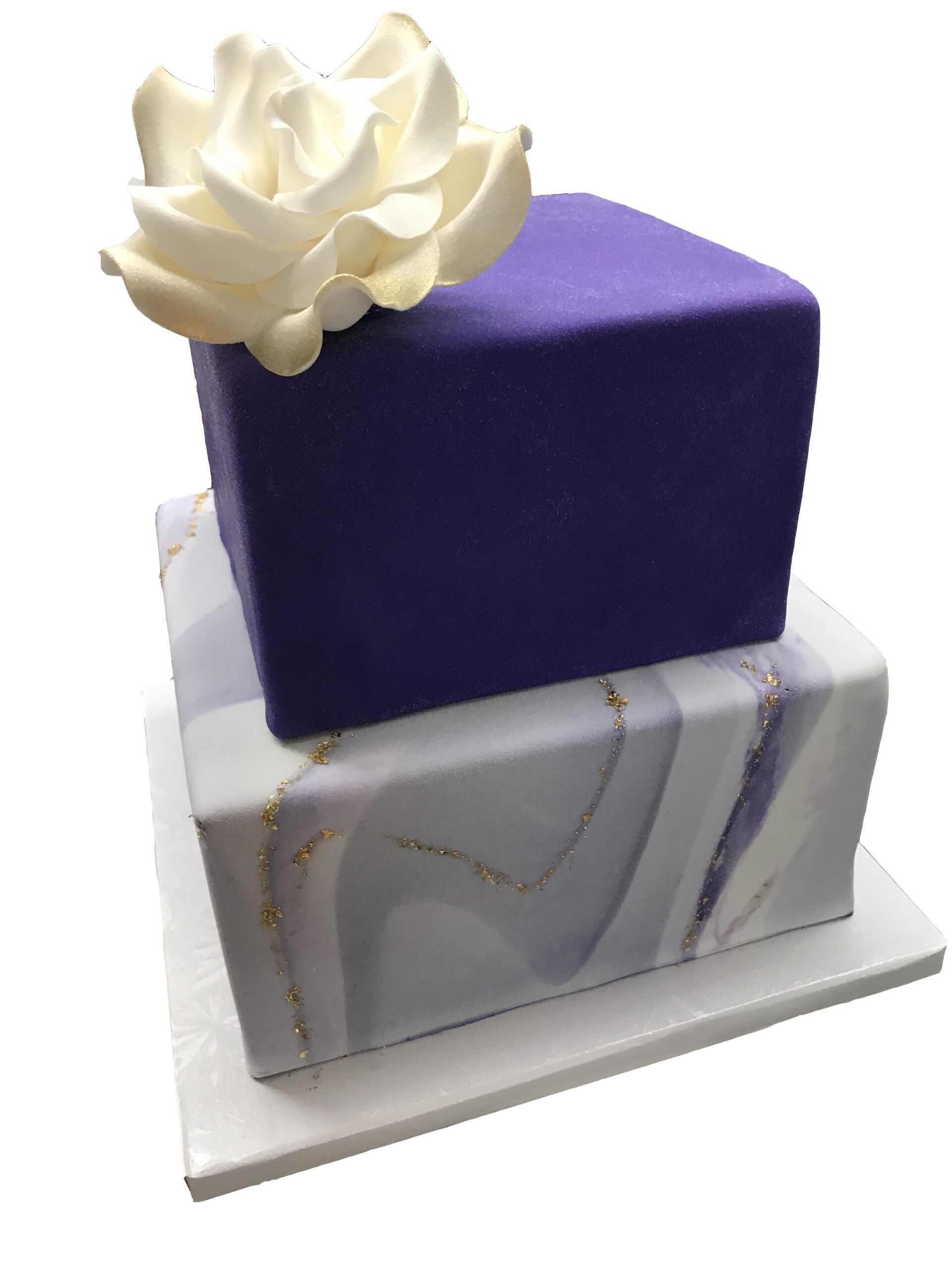 A 2 Tier Square Wedding Cake In Ivory Finished With Purple And