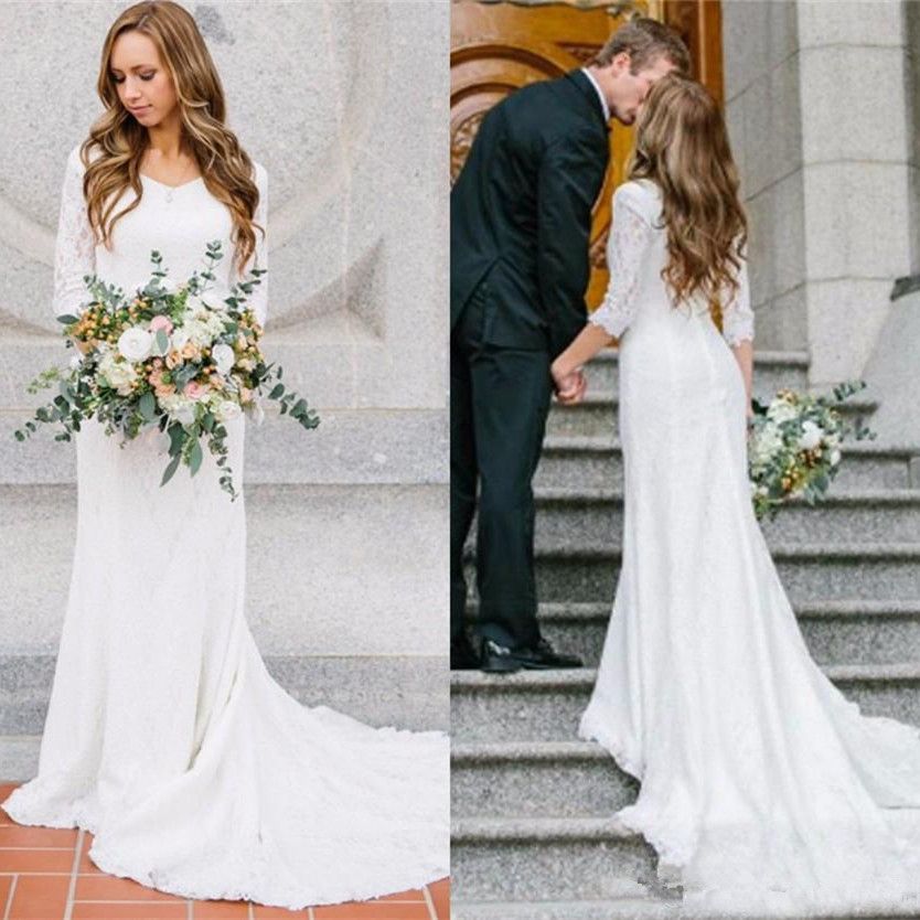 Modest Design Full Lace Wedding Dresses Three Quarter Sleeve Mermaid
