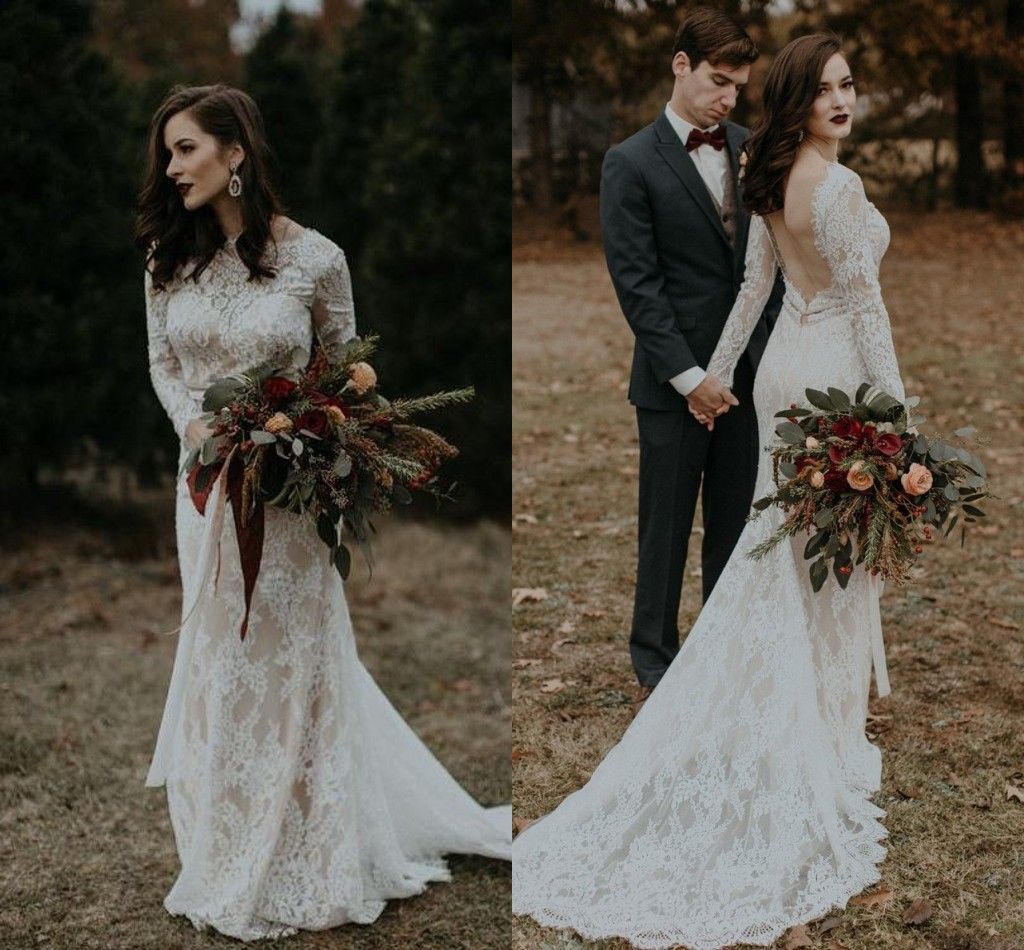 Long Sleeve Vintage Wedding Dresses Backless Rustic Lace Wedding